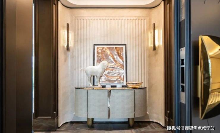 电梯厅的宠物识别按钮是艺术家定制款;入户门把手出自艺术家刘建华之手,用整块实心铜锭经锻造、打磨、电镀等多道精密工艺制成,握住的瞬间就是与艺术的触碰