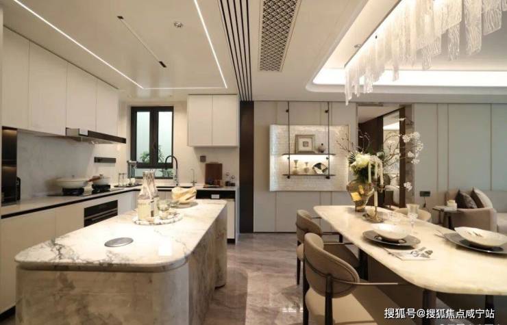 再来看看134㎡3室2厅2卫样板房。比起112㎡户型,这个客厅要宽敞很多,岛台也可以做成独立样式,摆放6人长桌也绰绰有余。主卧采用270度拐角飘窗设计,采光面拉满。