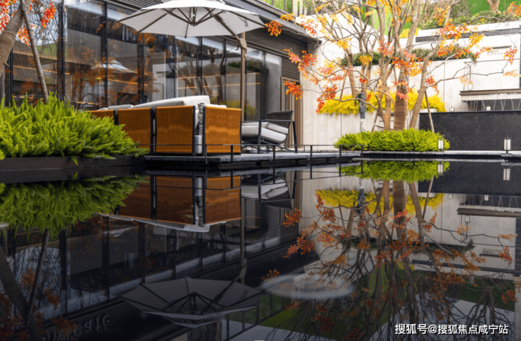 在下沉式景观庭院两侧,是不同的邻里空间。一侧是邻里中心,涵盖恒温泳池以及宽阔的健身房空间。当业主锻炼时,不被空间局限。透过落地窗,可以一边挥洒汗水,一边尽情欣赏庭院中的美景。