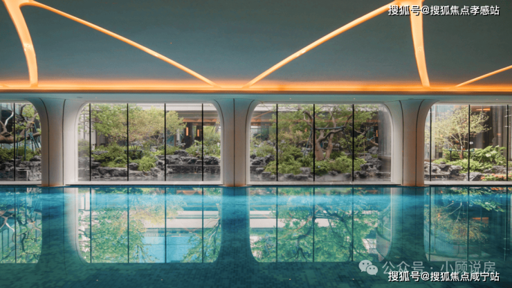 艺术馆般室内无边际泳池,在内部空间设计上,微微拱起的穹顶像云朵漂浮在上空,两侧的柱子成花瓣般的典雅造型,向上延伸,形成独特的记忆点。中央庭院一侧的落地幕墙玻璃,实现自然景观的室内延伸感。泳道尽端的景泰蓝背景墙,更是加强了空间的奢华氛围。