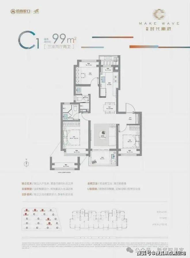 建面约99㎡户型为经典的飞机户型,客厅两侧卧室,三代人起居各有天地,私密无干扰;减少走廊,空间使用率高;独立入户玄关,从容收纳,更讲究居家的私密性;全屋房间做到飘窗采光,全部明卫,堪称教科书级别的设计。
