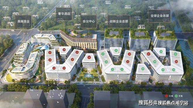 基本参数:占地约7万方,建面约34.5万方,自持60%,由23幢独栋办公、3座甲级办公与1座行政公馆、1座酒店及商业组成