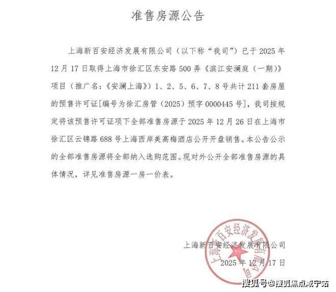 将于12月26日开盘销售