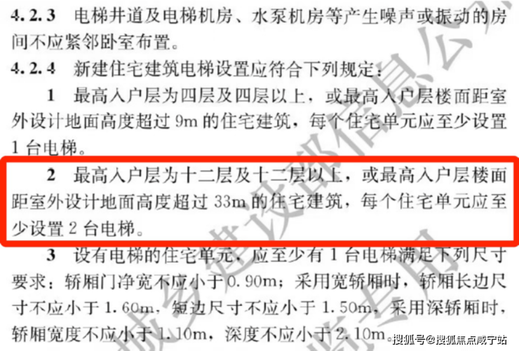 ② 5.1起执行住宅新国标,最高入户层为十二层及十二层以上,或最高入户层楼面距室外设计地面高度超过33m的住宅建筑,每个住宅单元应至少设置2台电梯。