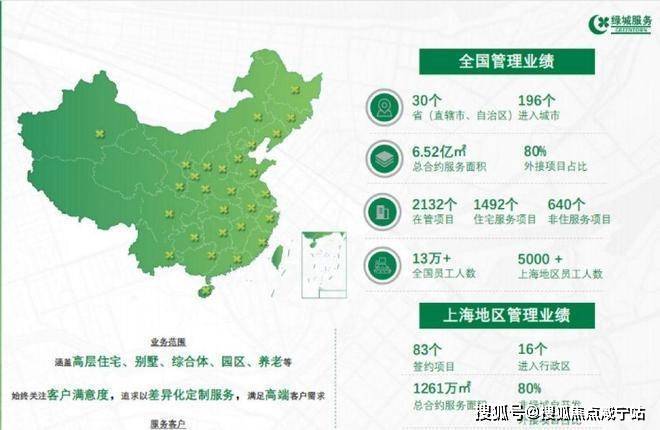 绿城物业在上海地区服务类型项目涵盖别墅,住宅,写字楼,综合体等,其中不仅包括黄浦湾,玫瑰园,融创·玉兰花园等上海地区知名度较高的各类高端住宅,还承接了BHC中环中心,绿城浙铁·长风中心等商业,城市综合体。