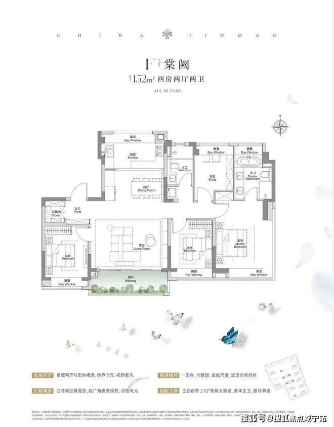建面约117㎡3房2厅2卫,做到了3+1开间朝南+5个飘窗+主卧套房设计+270°转角飘窗,所有的尺度都有进一步提升。