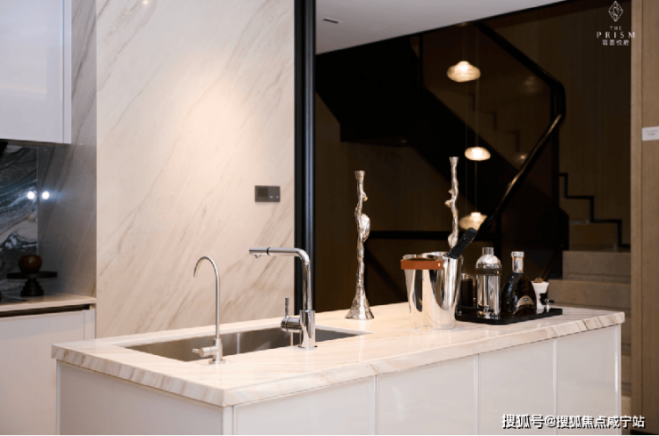 半开放式结构搭配岛台设计,洄游动线自由灵动,白金沙石材岛台串联厨房与餐厅,让烹饪成为家人互动的温馨时刻。