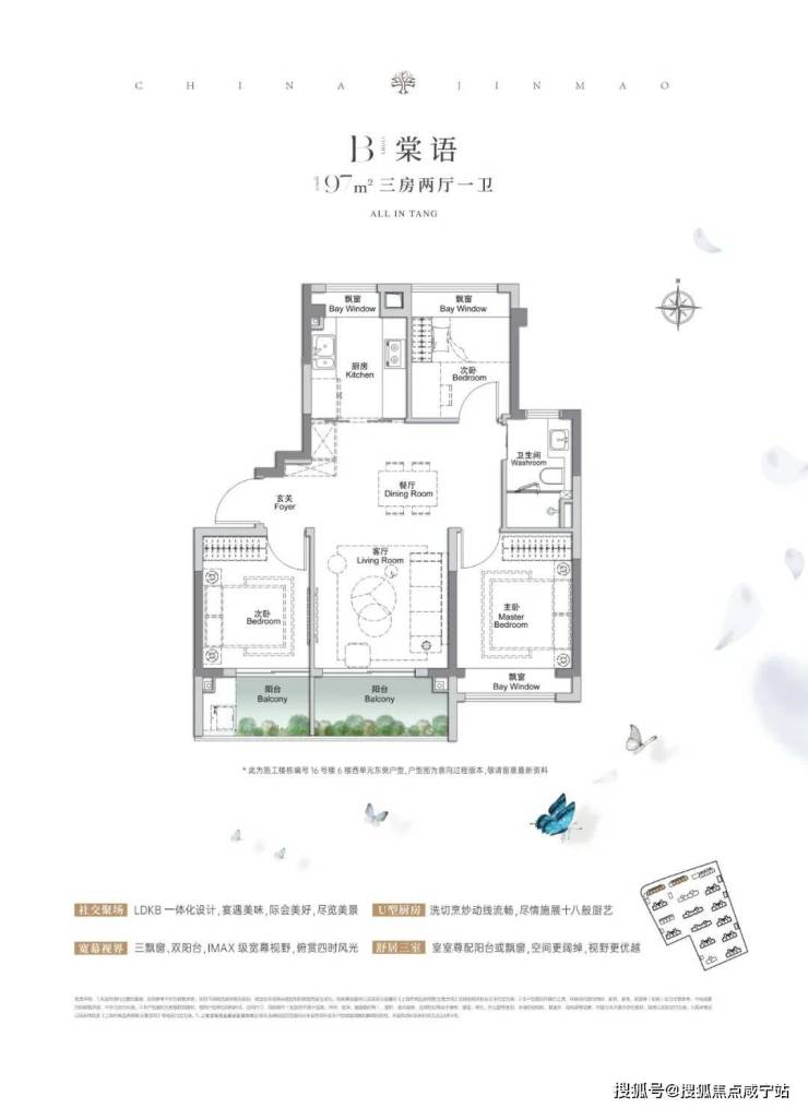 建面约97㎡3房2厅1卫,户型三开间朝南、再加上“3个飘窗+双面阳台系统”,不管是采光、视野、通风、私密性,还是实用性都十分出色。