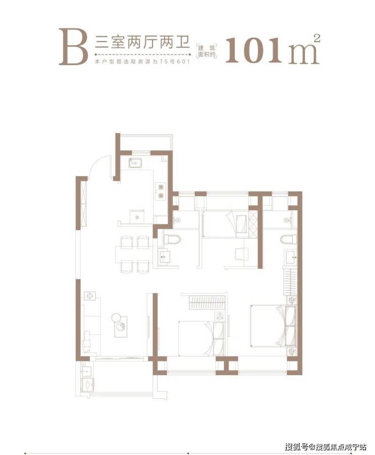 1、约101㎡均为3房2厅2卫,A、B户型分别是边套、中间套,满足不同人群的居住需求。