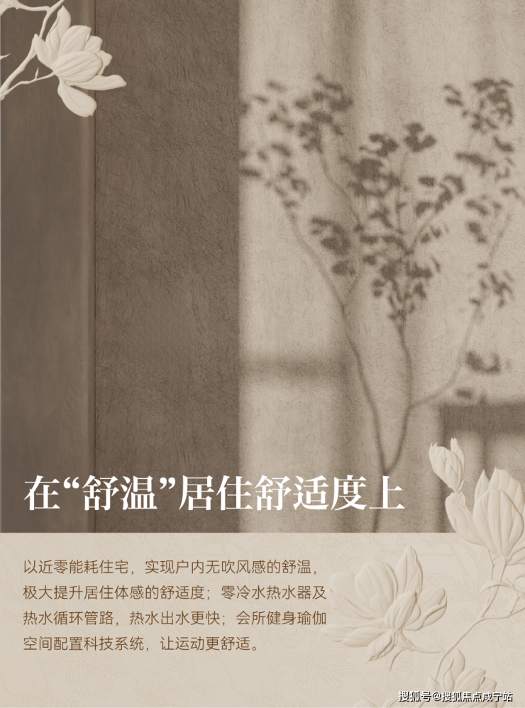 在“舒温”居住舒适度上,以近零能耗住宅,实现户内无吹风感的舒温,极大提升居住体感的舒适度;零冷水热水器及热水循环管路,热水出水更快;会所健身瑜伽空间配置科技系统,让运动更舒适。