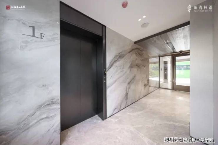 电梯厅墙面铺设大面积岩板,吊顶也颇具设计感。