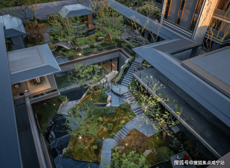 再往里走就是近460㎡的下沉式庭院,精选太行山金景石堆叠成小山丘,引进溪水汇聚成池塘,并移栽岭南珍贵的古桩铁冬青和中华原生乌桕树,形成一幅立体山水画卷。