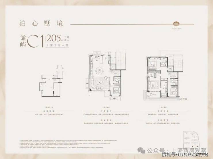 户型采用“垂直动静分离”设计,所有卧室静谧分布于楼上,客厅、餐厅等动区巧妙布置于一层,彻底解决多代同居的作息干扰。一层特别规划南向老人套房,体贴长者生活起居。二层则专设豪华主卧套房,形成卧室、明窗衣帽间、双台盆主卫流畅衔接的环形动线,提升私属尊享体验。