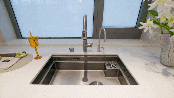 多功能水槽龙头轻松切换用水模式,滨特尔前置过滤器+末端直饮水+中央净软水机,全屋净水呵护家人饮水健康,还有线形凉霸默默为烹饪者送来清凉。所有展示橱柜皆为交付标准,包括上柜、下柜、拉篮、随心抽,以及特别定制的飘窗水槽与水槽柜——每一处细节,都为真实的生活而考虑。