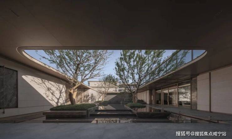 步入社区大堂后,一座叠水庭院成为视觉焦点。水流从阶梯式砂岩平台倾泻而下,与镜面水池相接,形成“声景”与“视景”的双重沉浸。