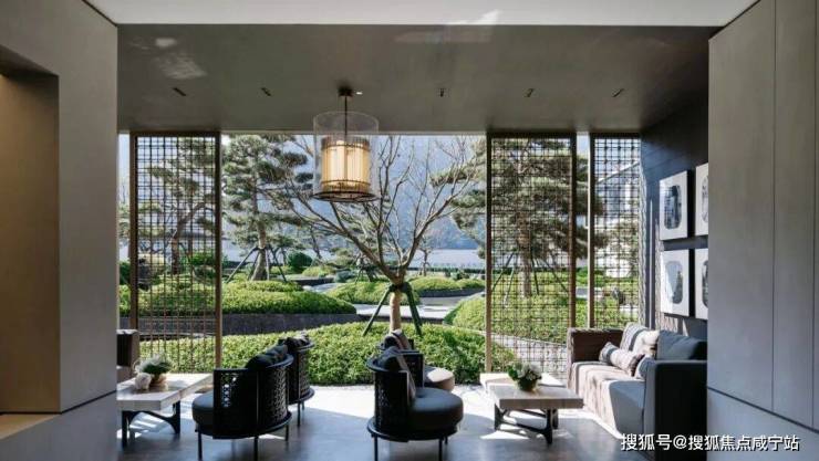 东方意境融于品质用材:石材迎宾、高品质植被、格栅意境