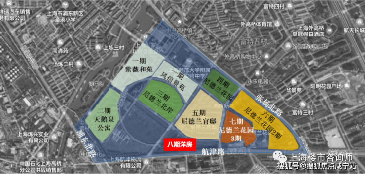 由航津路、浦东北路、张扬北路围合而成,深耕了十多年,分9批建设,整个城区基本已经建设成熟,不管是入住人口还是商业教育医疗设施,都符合百万方一个大型居住区的要求。