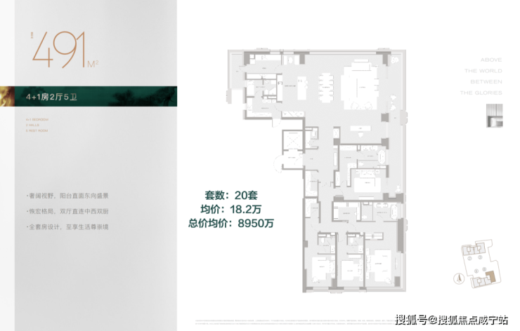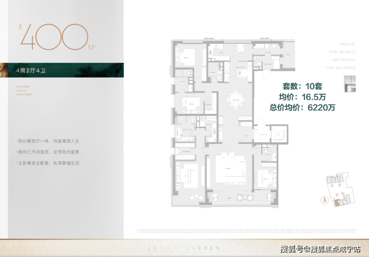 400㎡,4房4卫,单价16.5万,同理的西边套,户型几乎完全相同,不赘述了,单价提升的逻辑就是所在的楼栋南侧更开阔一些。