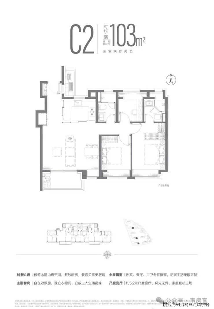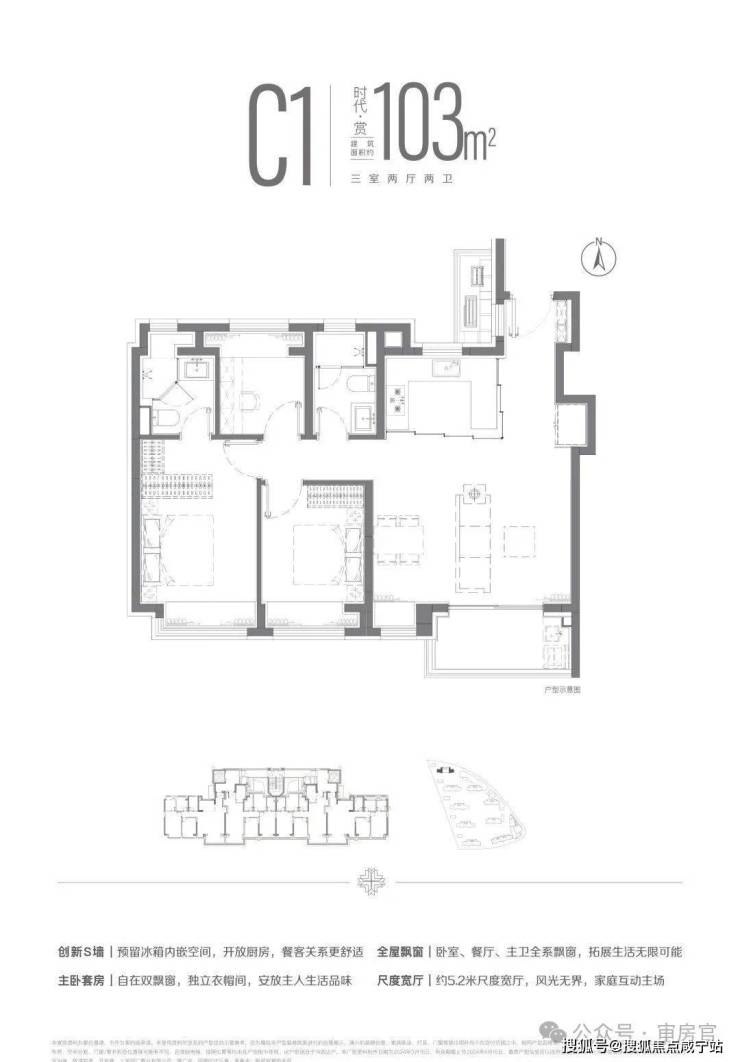 建面约103m²三房两厅两卫户型,南北双卧L型270°揽境飘窗设计,更大限度地让自然融入与自在之中,更宽阔的空间尺度,让自在生长与自然之中。