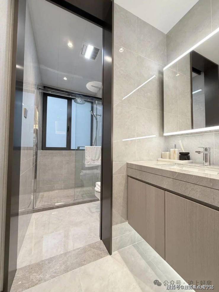 另外,一般百平米主卫淋浴房都是钻石型的,但项目是“一字型”的。“一字型”相比“钻石型”,洗澡空间更大,哪怕带着小朋友也不用挤得“转圈圈”,舒适度提高了不止一点点。