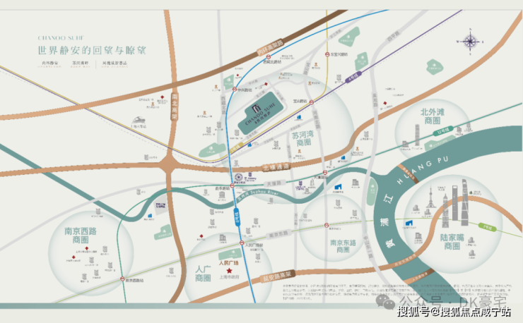 上海象屿·苏河琹庐售楼处电话:400-8800-703 位于内环静安区,直线约300米可达中兴公园和交通公园,距静安大悦城、万象天地、宝格丽酒店、苏河湾世界级滨水商务区等配套直线约1KM,距人民广场直线约1.5KM,周边聚集了超21家跨国公司地区总部,约3KM国际生活圈,涵盖陆家嘴、人民广场、静安寺、南京路、外滩、新天地等繁华CBD都市生活圈。