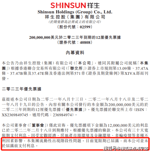 时间来到2022年3月21日,祥生控股集团发布公告称,公司未能按期支付2亿美元债的1200万美元利息。