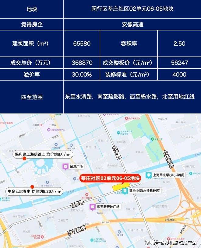 上海第六批次土拍首日,安徽高速经过78轮竞价最终以总价约36.89亿元竞得闵行莘庄地块,溢价率30%,楼板价56247元/㎡,装修标准4000元/㎡,成为莘庄地区“新地王”。