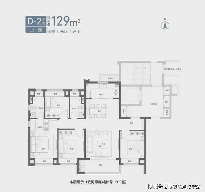再来看看建面约129㎡4房2厅2卫。大面宽,大阳台,尺度感和空间感都相当强,对改善购房者而言是个福音。