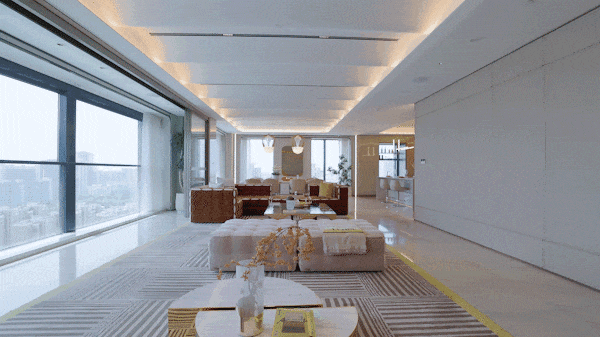 该户型呈三梯一户的设计,同样是3.6米的奢阔层高,朝南横向跨度超37米,会客厅面宽超18.5米,空间奢阔;户型东、南、西三面全景玻璃幕墙,超270度环幕视野景观震撼。