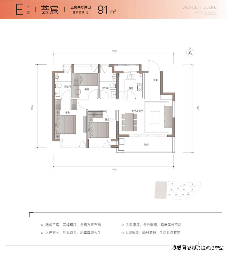 项目主力户型建面约89m²3房2厅2卫,近10米南向面宽,约6.3米的超大阳台打造更舒适的空间尺度感
