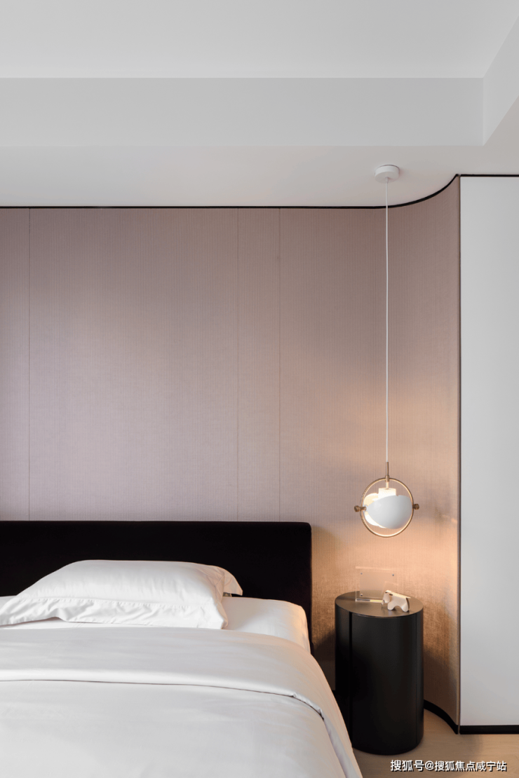 私密场域依旧保持静谧,黑白色基础上搭配了更多的色彩,例如深棕、浅紫等,艺术品的衬托深邃迷人,热络了家的氛围。
