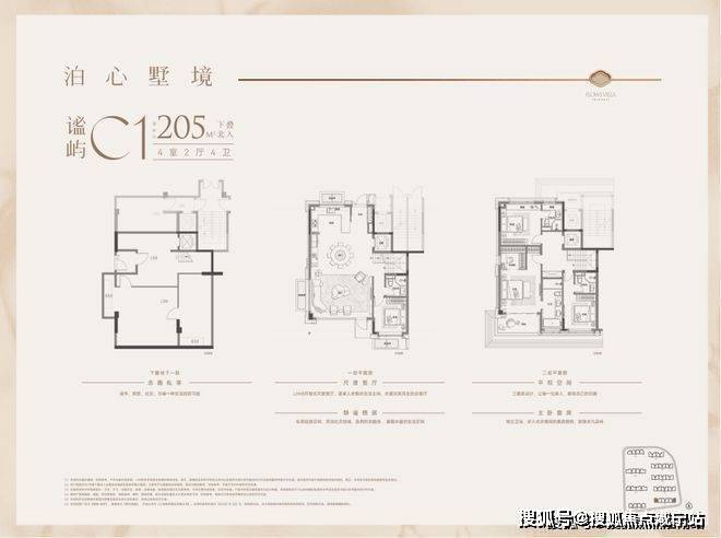 户型特点:下叠边套,南向面宽约9米,客餐厅同宽约5.8米,空间开阔。一楼设南向卧室,采光好且视野佳。二楼为三套房+主卧总统套房设计,主卫南向,可容纳浴缸和双台盆。地下室方正,附赠采光井,利用率高。