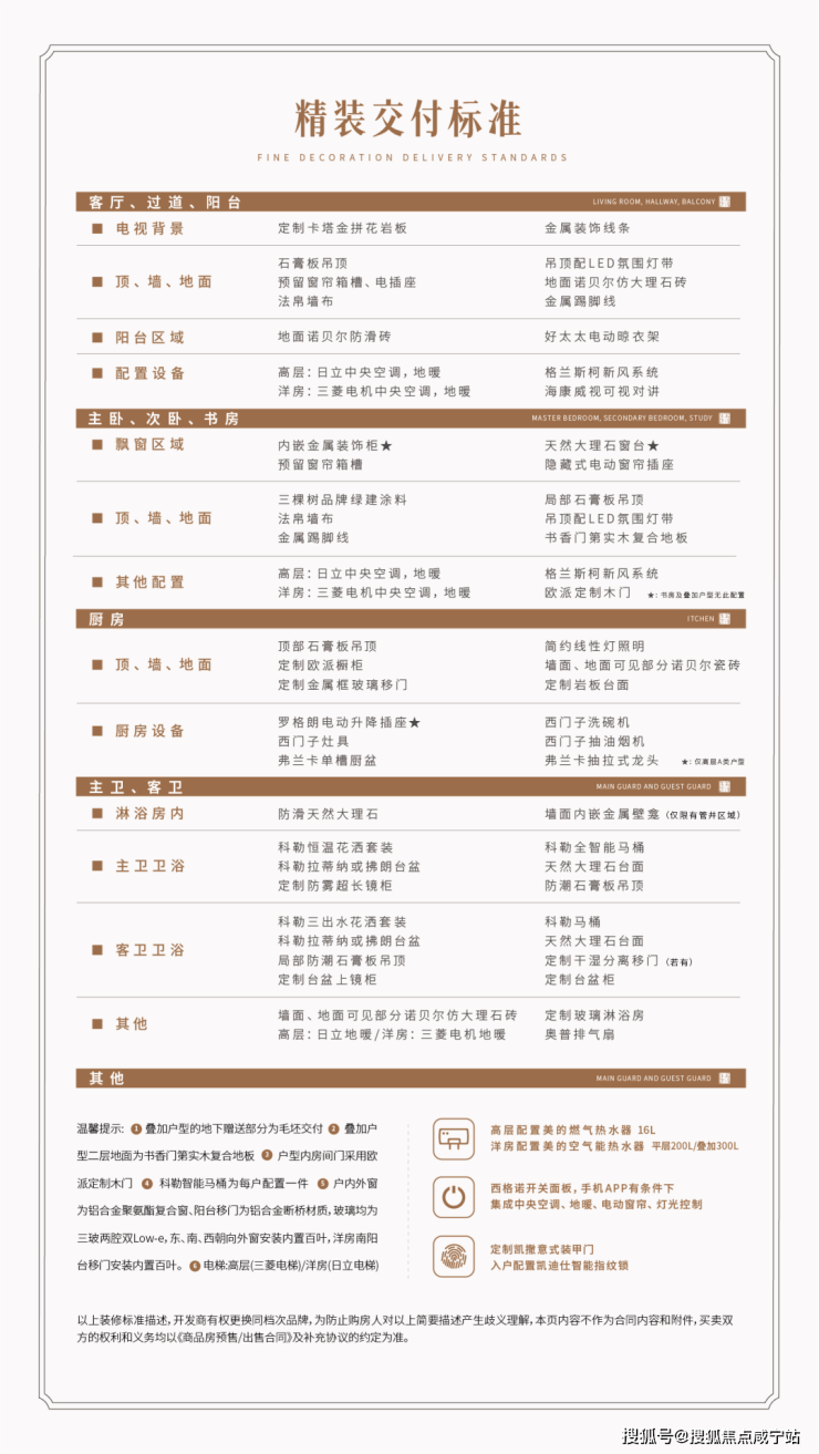 项目装修标准也是诚意满满,中央空调、地暖、新风系统“三大件”配齐,厨房、卫浴也有不少细节交付标准。