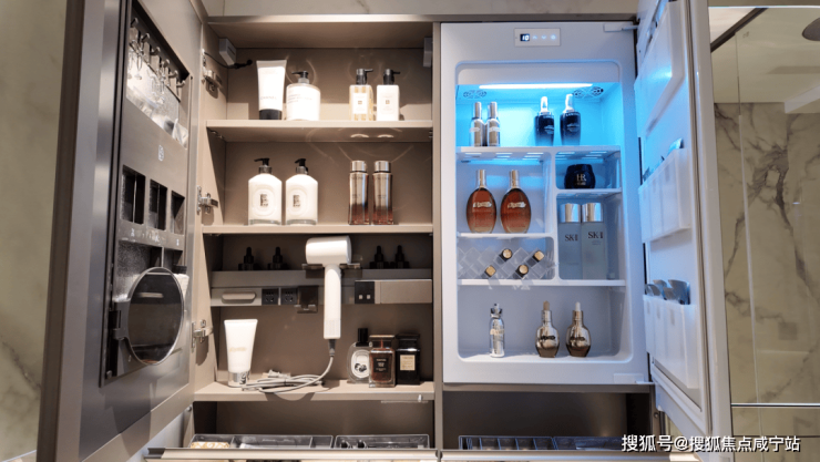 主卫配置了高仪(或同等品牌)的顶喷,唯宝智能马桶,镜柜内的美妆冰箱也同样是交付标准:
