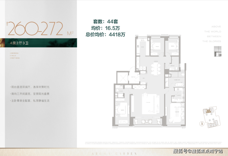 400㎡,4房4卫,单价16.5万,同理的西边套,户型几乎完全相同,不赘述了,单价提升的逻辑就是所在的楼栋南侧更开阔一些。