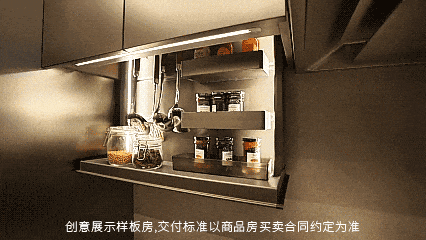 •电动调味舱(建面约143㎡户型):隐藏调味品易拿取,保持台面整洁;