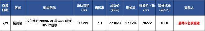 2024年7月9日,上海第三批次土拍中,北京城建与越秀地产组成的联合体以高达22.3亿元的价格成功竞得杨浦长白社区N090701单元201街坊H2-17地块(即领翠滨江),其成交的楼面价格定格在70272元/平方米,溢价率约17.12%,装修标准不低于4000元/㎡。