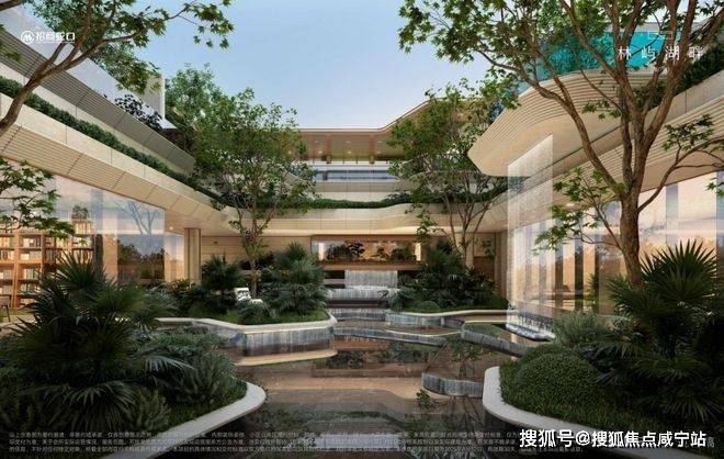 在此能俯瞰整个社区最核心的、浓度最高的景观节点。地上的戏水池和架空层,地下的多层次庭院都尽收眼底。峡谷意境的立体庭院,让湖居生活充满独特的诗意。