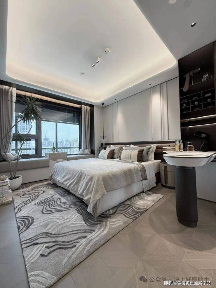 吊顶采用一体化大平顶加回型吊顶设计,并且在四个角均匀做了圆弧处理,让整个空间感更加和谐圆润。