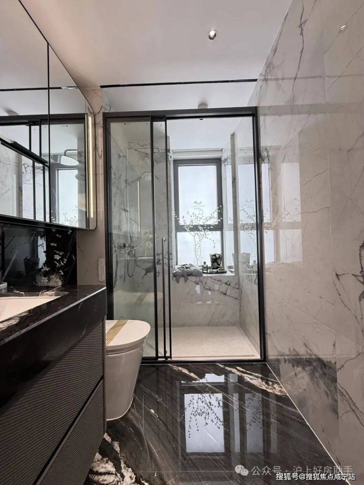 卫浴墙面采用寒江雪大瓷砖铺装,淋浴部分地面选用整块天然大理石。