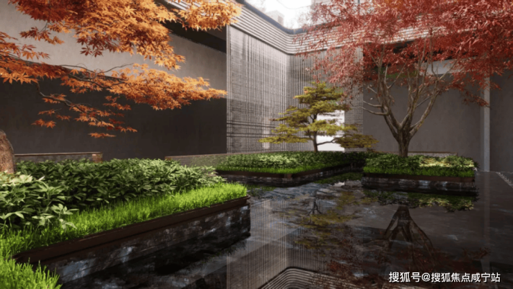 项目利用下沉式景观庭院,结合艺术花园、摩登水景等,打造了一座建面约1200㎡的高端下沉式会所,规划设有泳池、健身房、行政酒廊等场景。