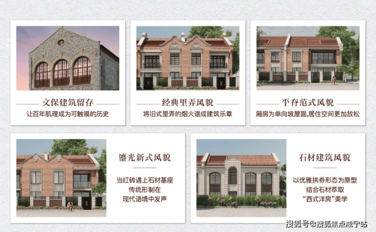全上海第一个多元化形态风貌别墅新房,五大经典建筑立面复刻百年风貌Art Deco神韵,包括文保建筑留存、经典里弄风貌别墅、平脊范式风貌别墅、鎏光新式风貌别墅和石材立面风貌别墅。