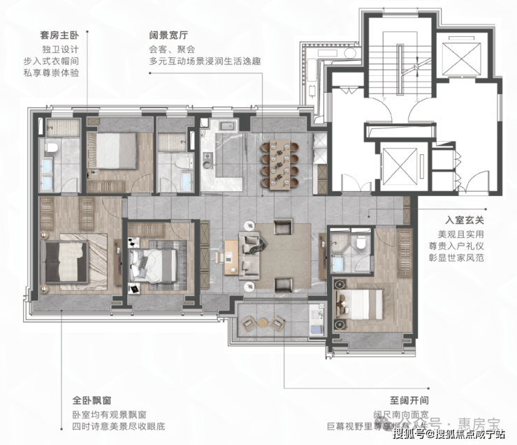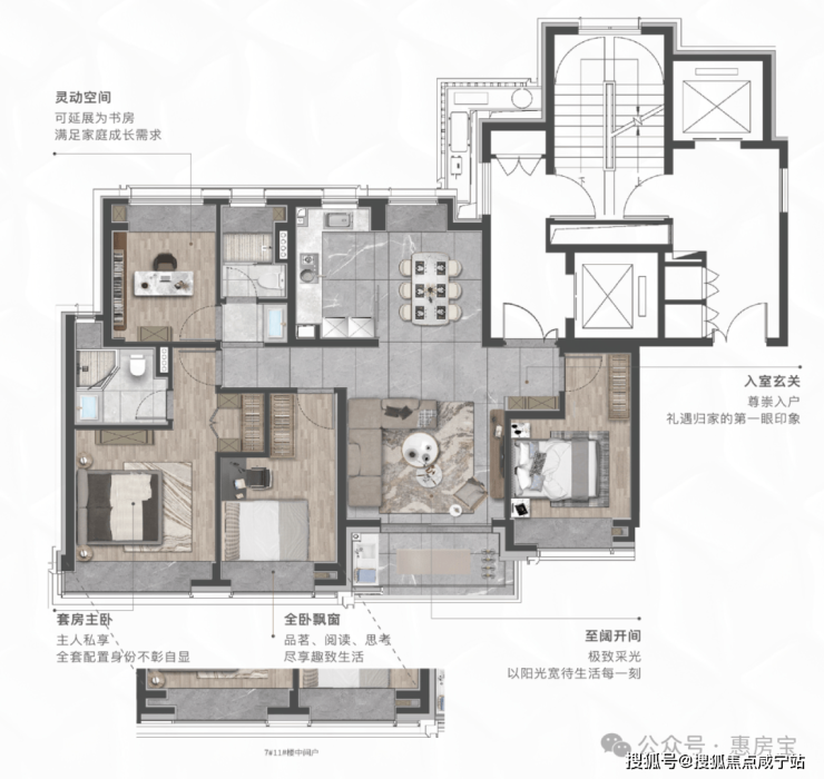 走进建面约155㎡央景平层之内,随时都能感受到生活的尊贵身份感和仪式感,南向四开间设计,为室内引入更多光影与清风。双套间主卧设计,则是此间生活的精髓所在。它精准回应了现代家庭对独立空间与亲密共处的双重需求。