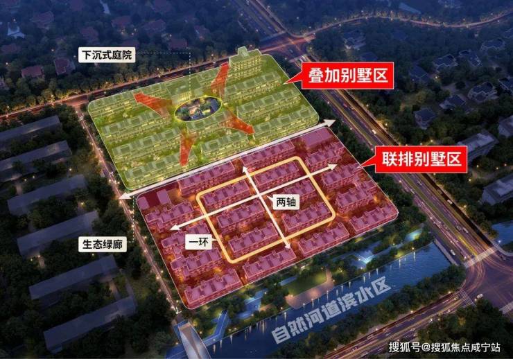 尚园以东西向的生态绿廊为界将园区自然分成2个墅区,北侧为4层叠加别墅区,南侧为3层联排别墅区
