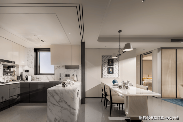 宽境阳台、客餐一体,全域贯通配合香奈儿高奢风,呈现超大尺度家庭公共空间;
