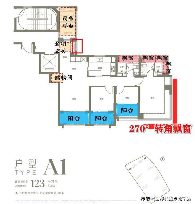同时户型还做到了全系多阳台设计+高实得率!以主力建面约123㎡3房为例: