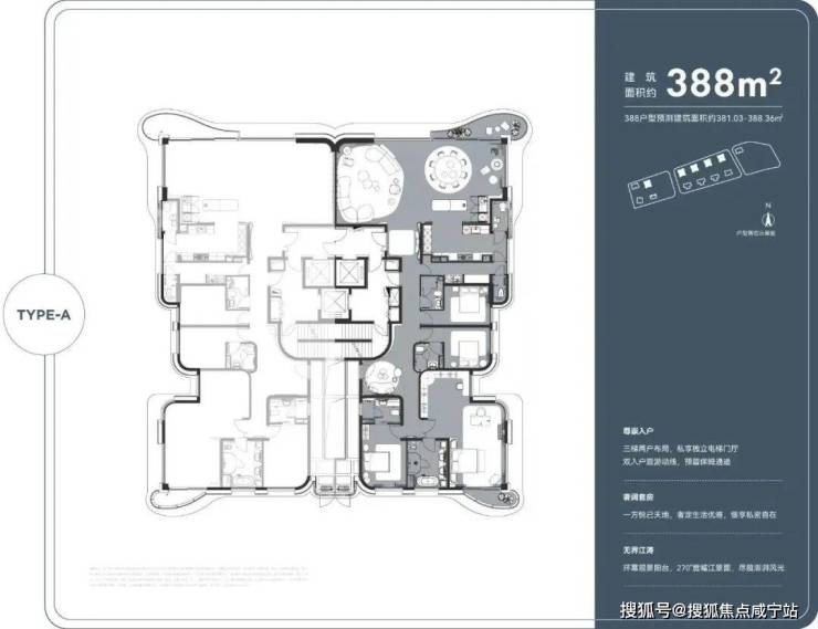 388户型总高约60米共15层,底部3层架空,高度约16米,通过底部架空层抬高底盘,最大程度的保证临江第一排拥有270°环幕观江视野。西边套更能收获陆家嘴城市景观视野,高区卧室窗景收纳陆家嘴四件套,窗框即画框;东边套则可以将杨浦大桥及北滨江互联网产业帝国一览无余;整栋楼底盘抬高以后,每栋可以实现双入户大堂的设计,双层挑高入户大堂净高最高约9米,二层入户大堂净高最高约4米,通过二层大堂可直接步行至社区商业,,也可以通过连廊步行至滨江步道。388户型都是三梯两户设计,每栋仅有22套388户型房源,还是非常稀缺的,另外每栋的顶层有1套约750㎡penthouse。