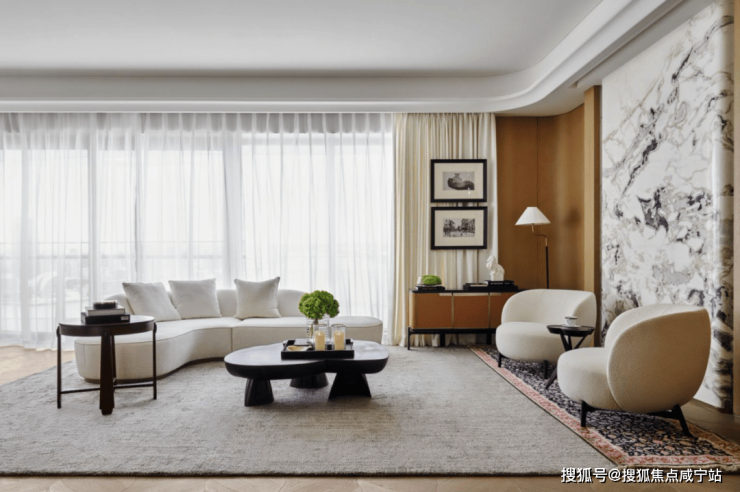 客厅空间采用大量造价昂贵的弧面设计,带来更有格调的审美价值: