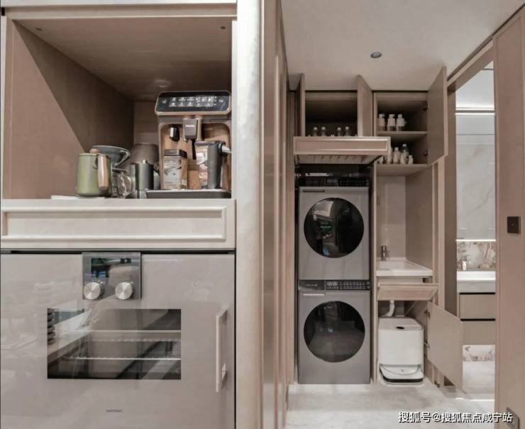次卫门外,做了小家政空间,洗烘套装上方,嵌入了抽拉隐形晾衣架,偶尔可以挂烘干的衣服。