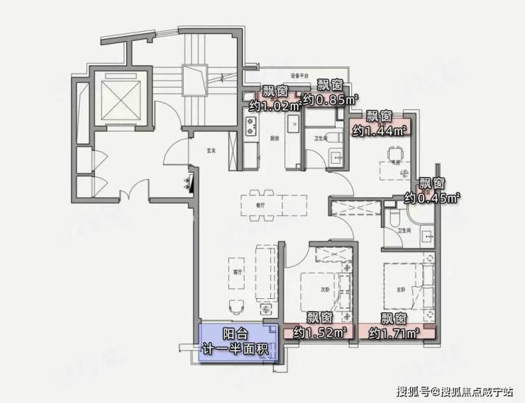项目百平三房,在计算阳台一半面积+飘窗赠送面积的情况下,实得率可以达到91%左右,完美覆盖了当下普通高层的得房率痛点。